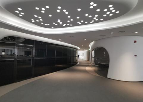 位于武汉楚河汉街,是武汉最高端的办公项目。设计师以Christopher的《星际穿越》为灵感,诠释了一种超现实梦幻的色彩,将“太空舱”的流线概念与“钢铁侠”的元素整体融入设计中,传达未来共享办公的全新空间模式。会议室隔断采用双变色层结构的非电致变色玻璃,可见光透过率低至0.01%,颜色清亮灰色,完美融合了设计师“以太空蓝、星际紫为主色调,将柔和优雅与韵律有序结合”的设计理念。